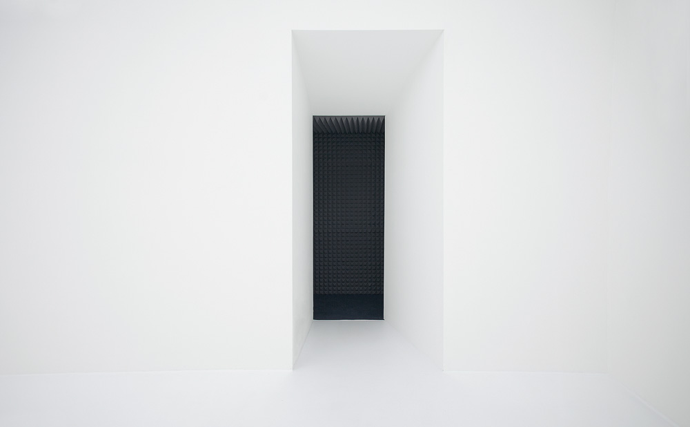 By moving through the dark corridor towards the bright room the visitor can experience a gradual change of sensory stimuli. When entering the bright room from the dark one is at first overwhelmed by the brightness and cannot see much depth. Then, the eyes slowly adjust to their environment. In the bright room, the spatial dimensions get lost in the bright light and can only be experienced by moving around in the space. A parallel movement of gradual transition takes place on the acoustic level: from silence to a high-pitched tone with two sound sources producing phase interferences. By moving the head/ears in the space, the impression of a narrow-gridded field of sound can be perceived. These sounds that linger close to one’s ears acoustically reduce the physical dimension of the room.