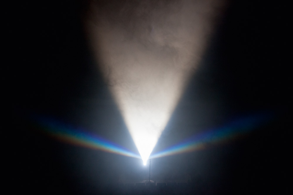 In the installation Linear Decomposition, a 30-meter long beam of light is thrown across a dark auditorium up to a large projection screen on the stage. The visitor sees the process of the decomposition of white light into the constituent color spectrum. By walking along the beam of light from the entrance side of the auditorium over to the stage, the visitor observes the process of the projection of light in the scale of an architecture in time. This ephemeral work opposes the conventions of its setup and changes the mode of reception in an auditorium by putting the focus on the process rather than the image on the screen.