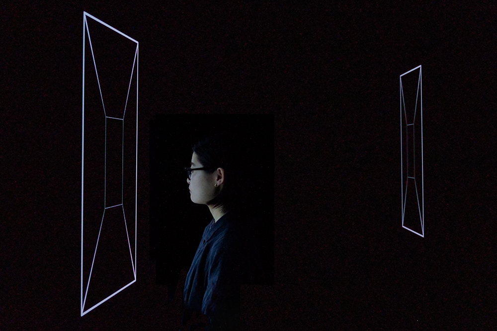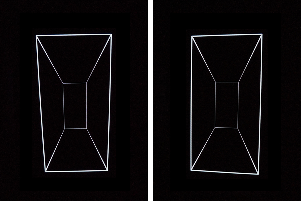 A video presented across two monitors conveys a sense of self-motion using minimal visual elements. The shaky movements of a wire-framed cube simulate those of a handheld object and hint at a human presence. The simulated movement in the video, the visitor’s movement, and the movement stimulated by the confrontation of both become indistinguishable.